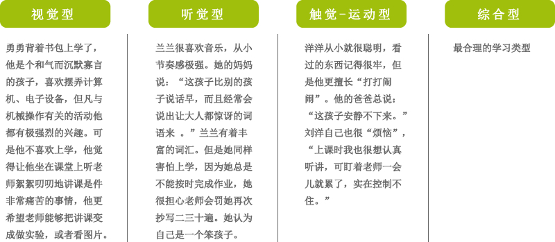 下面就详细介绍下孩子的学习类型有哪些,看看您家孩子属于那种类型?