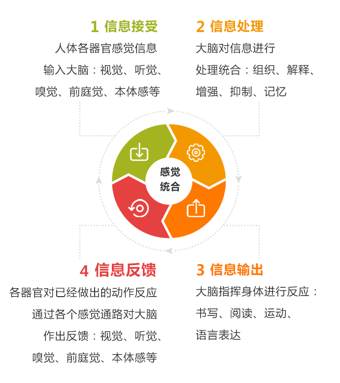 感觉统合是指将人体器官各部分感觉信息(如视觉、听觉、触觉、嗅觉、前庭觉和本体觉等)输入组合起来,经大脑处理(解释、比较、增强、抑制、联系和统一),对身体外的知觉做出反应,并反馈指导行为、语言、思维等的能力。
